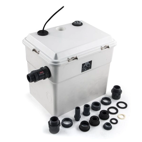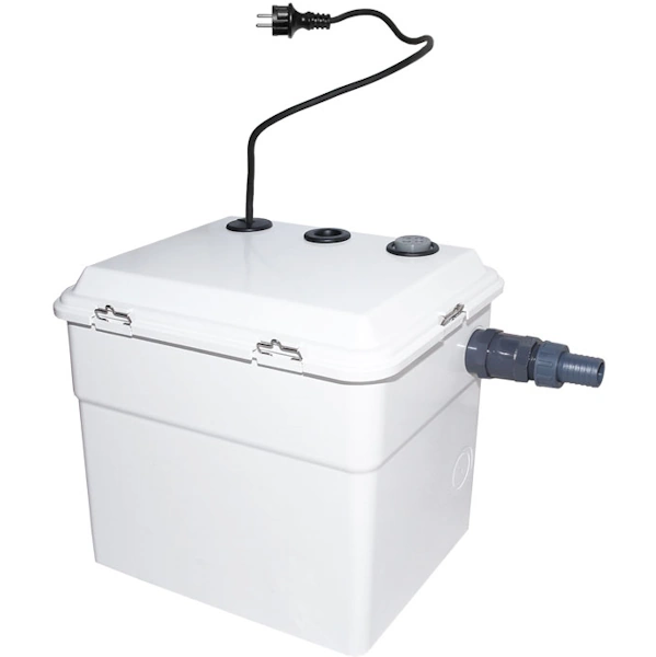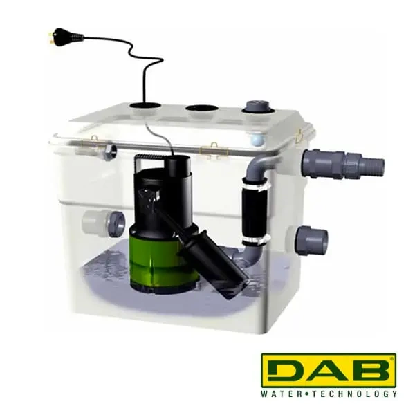 DAB NOVABOX — компактна автоматична каналізаційна насосна станція для примусового відводу побутових стоків (душ, пральна і посудомийна машина) в підвальних приміщеннях або там, де немає можливості під’єднатися до самопливної каналізації. Каналізаційний насос з подрібнювачем з високою продуктивністю — до 7,2 м³/год при напорі до 6,9 м. Автоматична робота (Plug & Play): повний комплект — резервуар 30 л, насос NOVA 300 A, фітинги, зворотний клапан — готова блокова КНС.